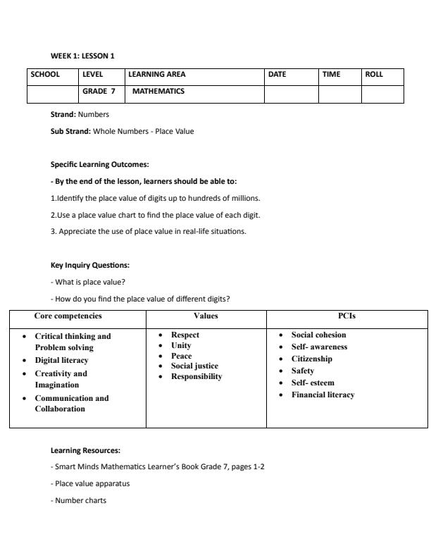 • Page 1 – Grade 7 Rationalized Mathematics Lesson Plans Term 1 – Kenyaplex