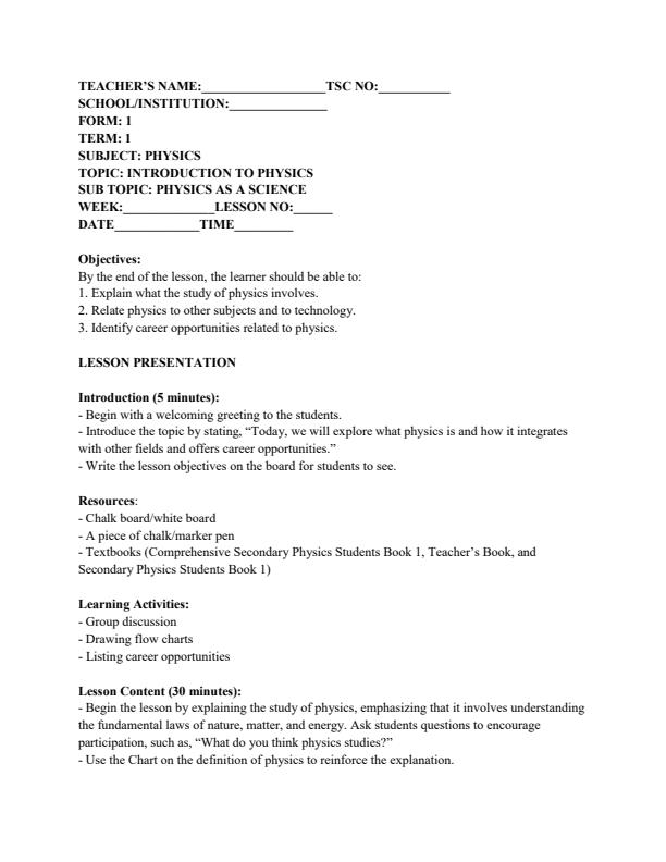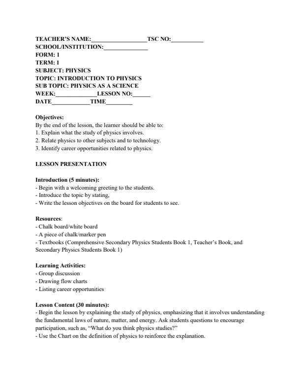 Explore comprehensive Form 1 Physics Lesson Plans for Term 1, exclusively for teachers. Engage students with structured curriculum content for effective teaching and learning.