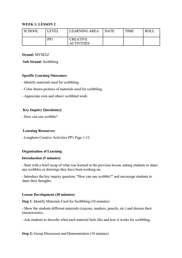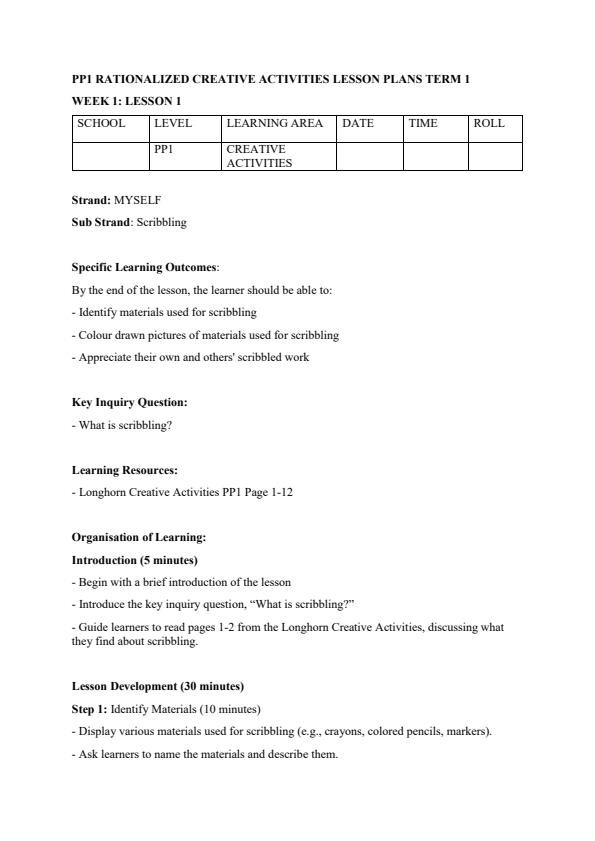 Access well-structured, CBC-aligned PP2 Creative Activities lesson plans for Term 1 based on the rationalized curriculum. Each plan provides clear learning outcomes, engaging teaching activities,...