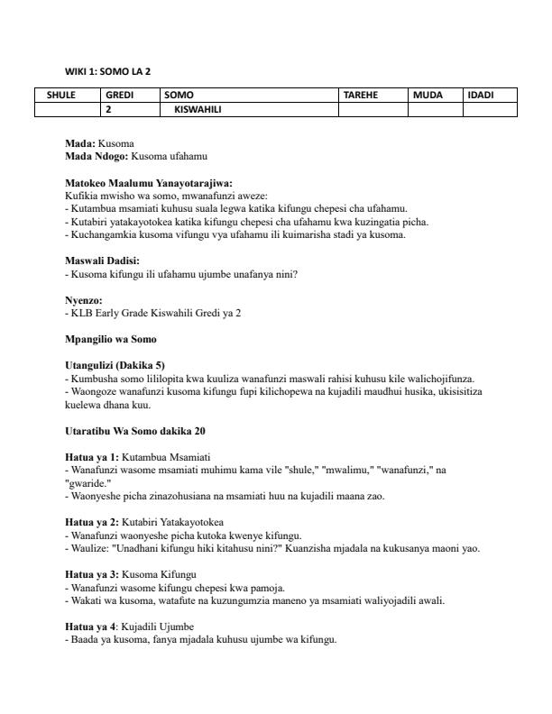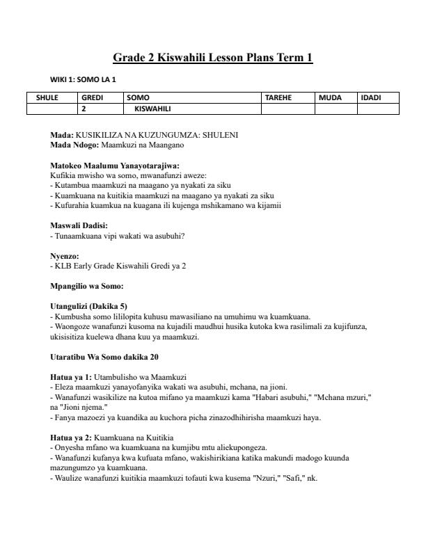 • Grade 2 Kiswahili Lesson Plans Term 1 - KLB Early Grade