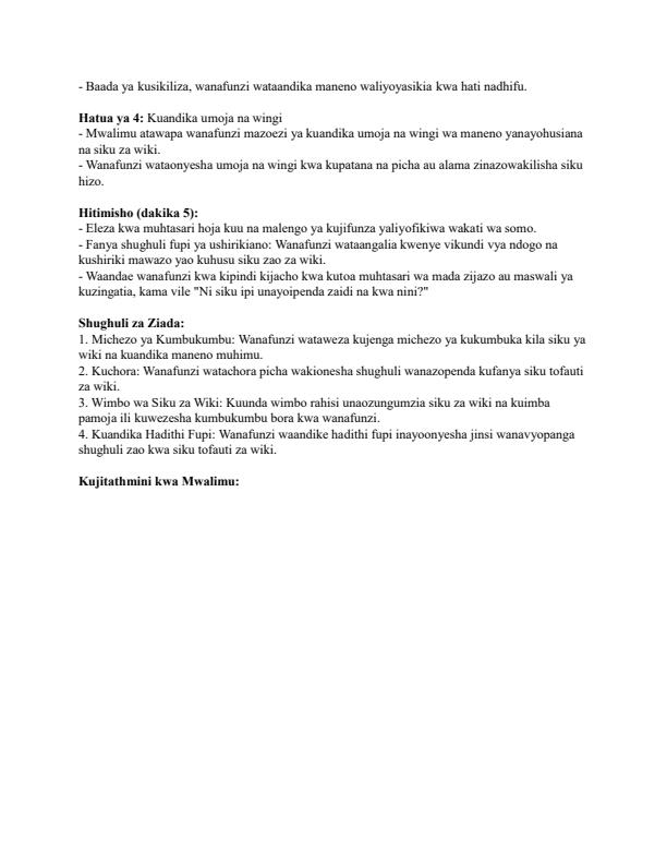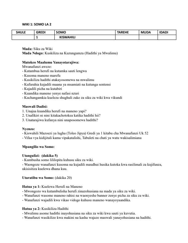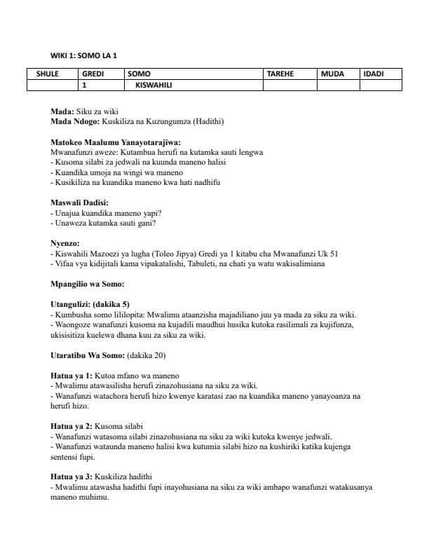 • Grade 1 Kiswahili Lesson Plans Term 2