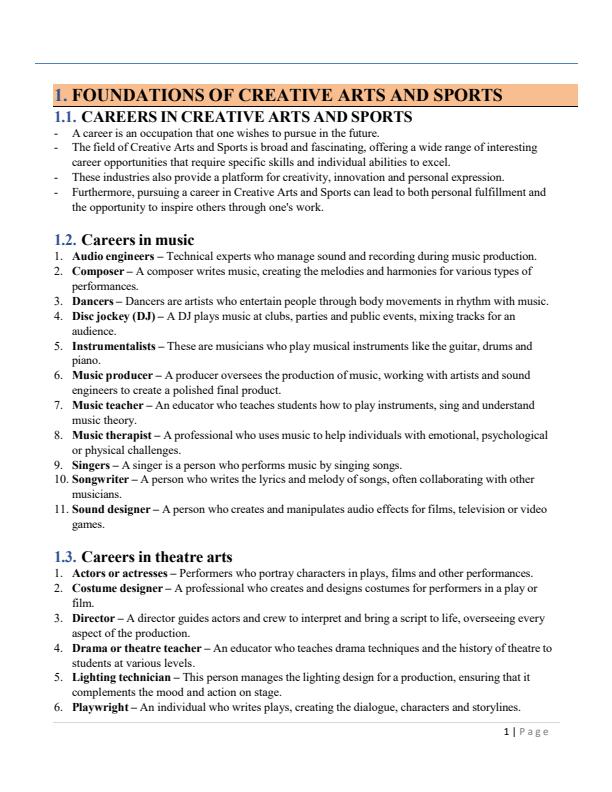 This document covers Grade 9 Creative Arts and Sports Notes for Term 1 work. It has covered in depth the content in the strands for easier understanding and delivery to the learners