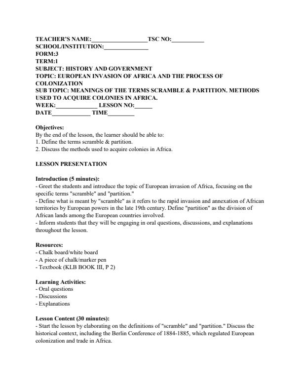 • Form 3 History and Government Lesson Plans Term 1