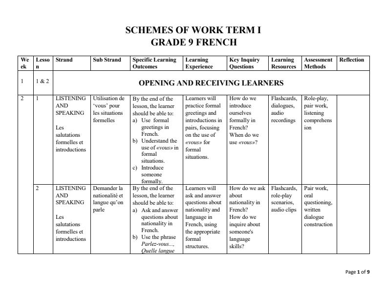 Explore Grade 9 Rationalized French Schemes of Work for Term 1, designed for teachers. Ideal for planning and delivering effective lessons in French. Perfectly catered to meet curriculum objectives...