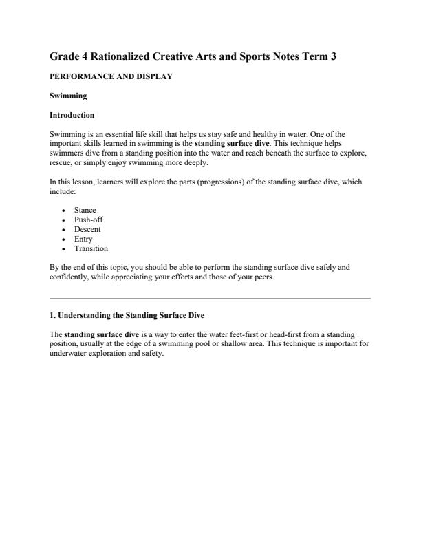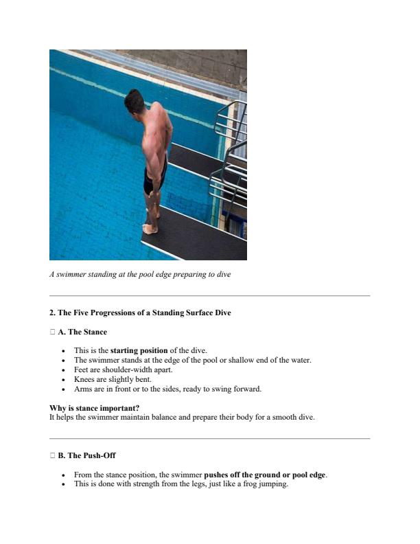 In this lesson, learners will explore the parts (progressions) of the standing surface dive, which