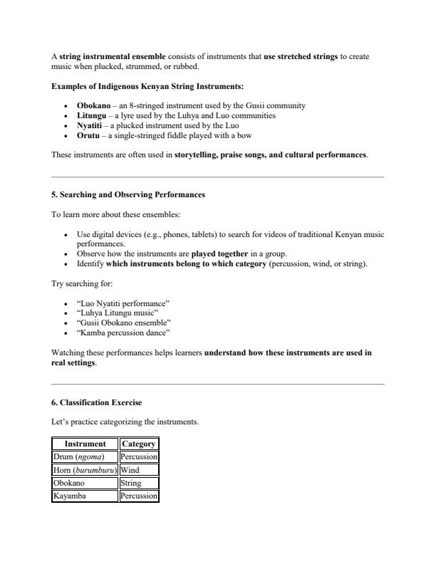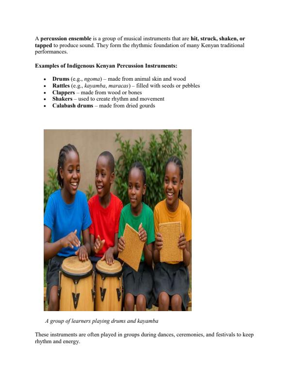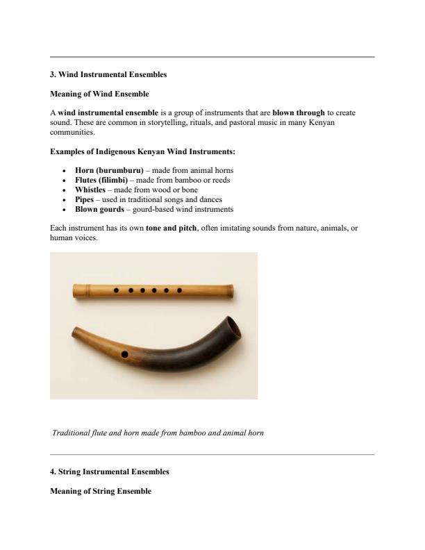 Music is an important part of Kenya’s cultural identity. Throughout the country, different communities use musical instruments to celebrate, communicate, entertain, and pass down traditions. These instruments are often played in instrumental ensembles—groups of instruments that perform together. In this lesson, we will learn about the three main types of indigenous Kenyan instrumental ensembles: