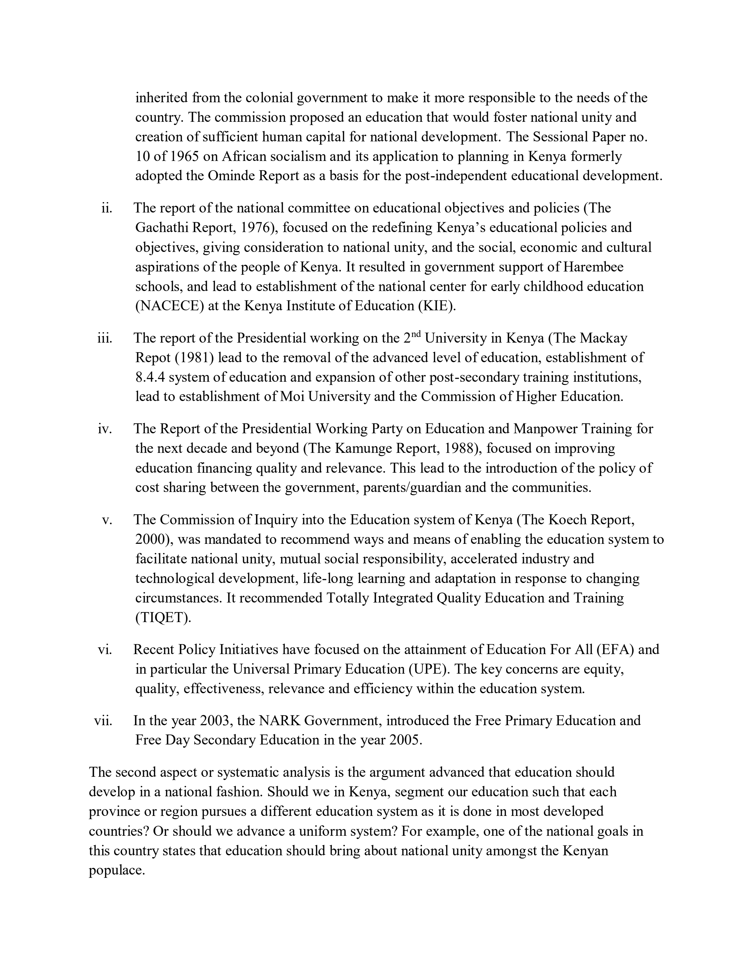 Secondly, the term systematic analysis really points to the development of education. It’s often argued that education should develop in an orderly fashion. In Kenya, good examples of this desire for orderly can be seen from the fact that education has had to be planned right from the dawn of independence by way of commissions, committees and task forces;