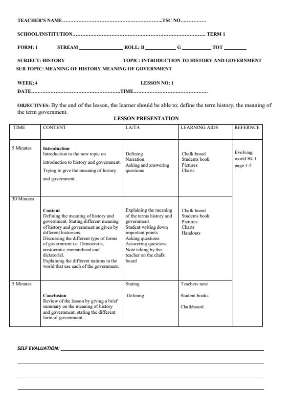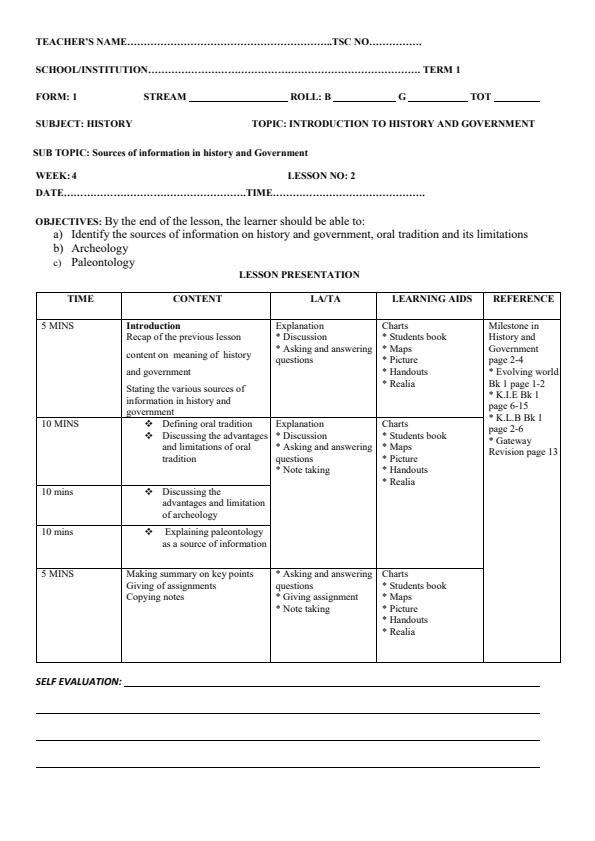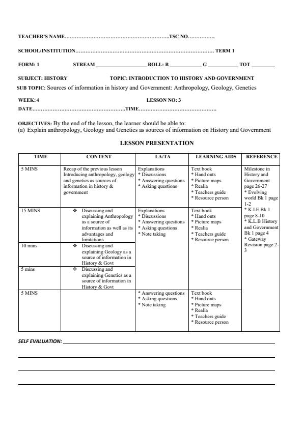 • Form 1 Term 1 History and Government Lesson Plan