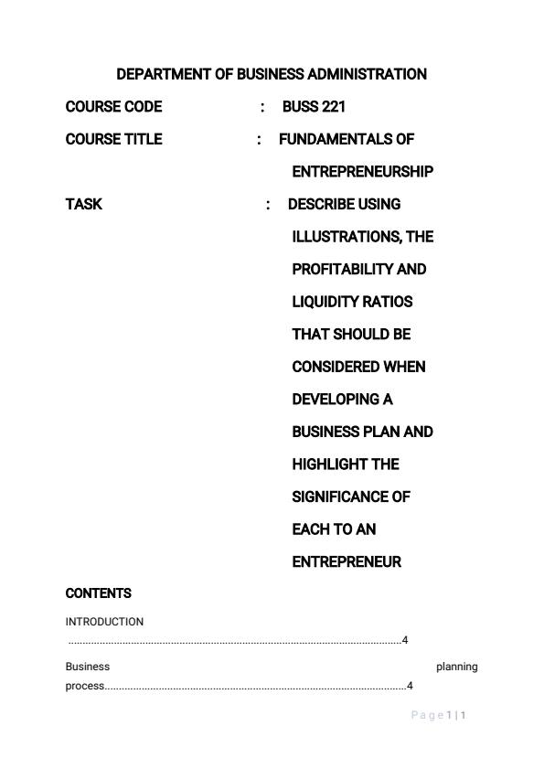 Describe using illustrations, the profitability and liquidity ratios that should be consider when developing a business plan and highlight significance of each to an entrepreneur...................................