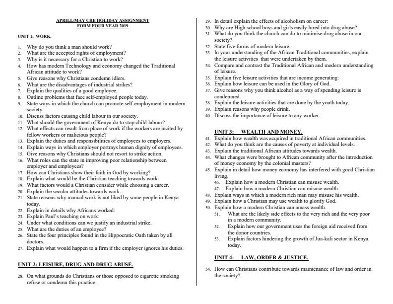 CRE Form 4 Past paper Holiday Assignment