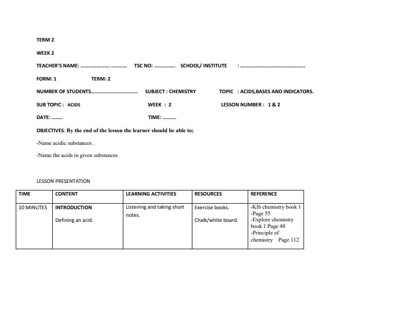 Chemistry Lesson Plans Form 1 Term 2 Week 2 to Week 5 Topics and Sub-Topics 1. Acids, Bases and Indicators - Acids - Bases - Indicators - Commercial Indicators - Universal Indicators and...