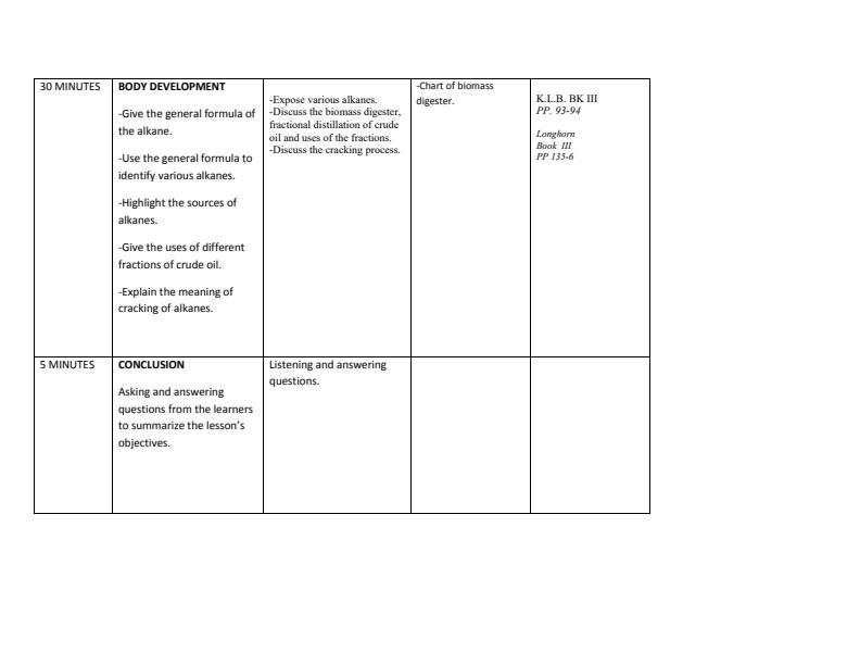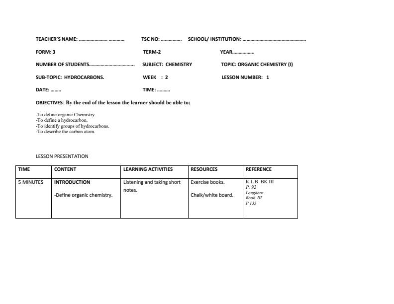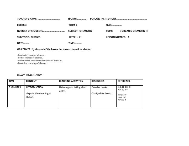 Form 3 Chemistry Lessons Plans Term 2 Week 2 to Week 5 Topics and Sub-topics: 1. Organic Chemistry I - Hydrocarbons - Alkanes - Naming of Members of Alkanes - Isomerism in Alkanes -...