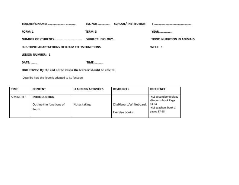 Biology Lesson Plans Form 1 Term 3 Week 5 to Week 10 Topics and Sub-Topics 1. Nutrition in Animals -Adaptations of ileum to its functions. -Food content in the alimentary canal of an...