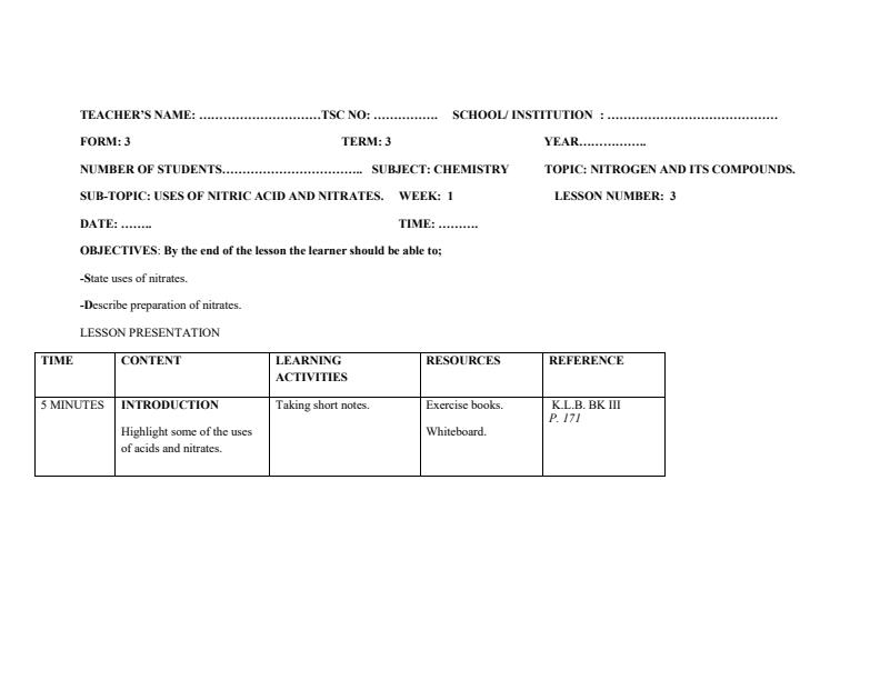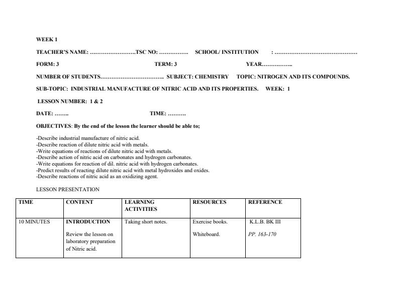 • Form 3 Chemistry Lesson Plans Term 2 Week 2 to Week 5