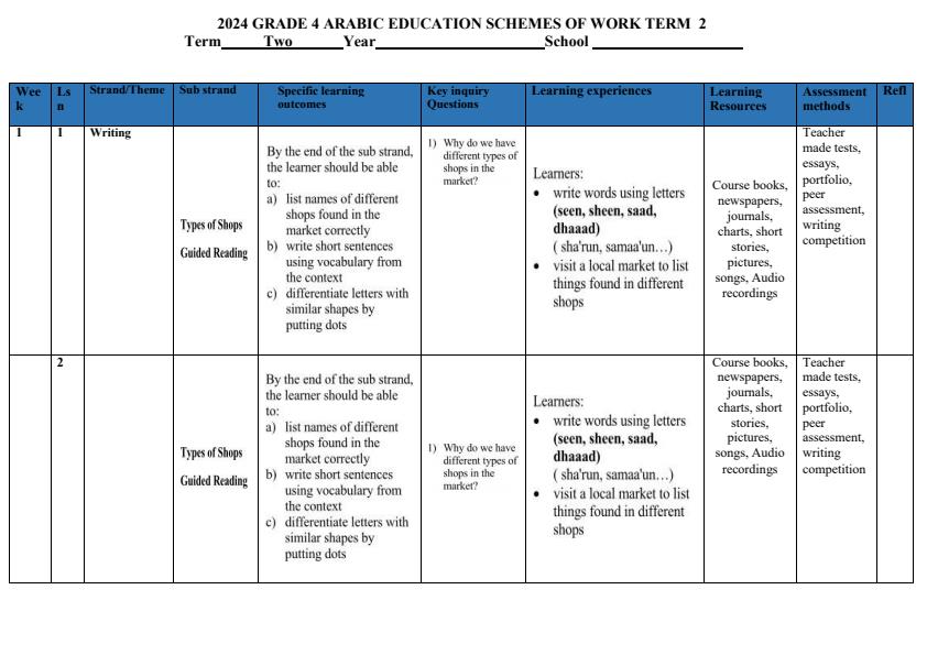 • Page 2 โ€“ 2024 Grade 4 Arabic Language Schemes of Work Term 2 โ€“ Kenyaplex