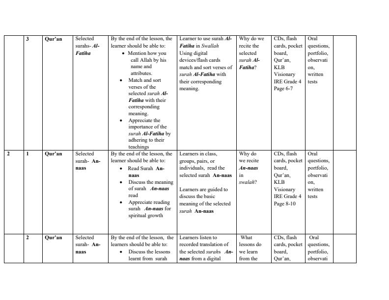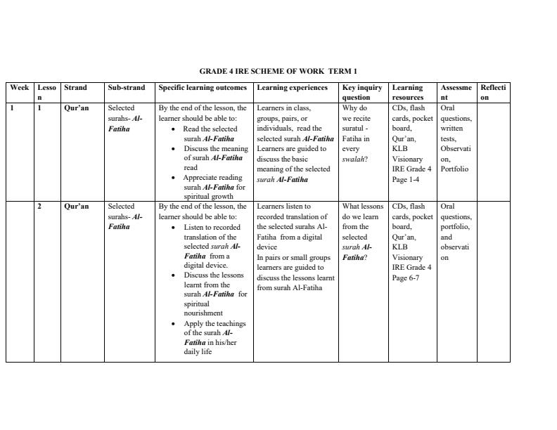 Grade 4 Islamic Religious Education Scheme of Work Term 1