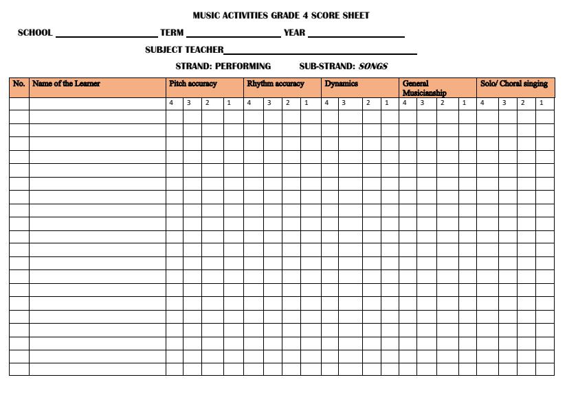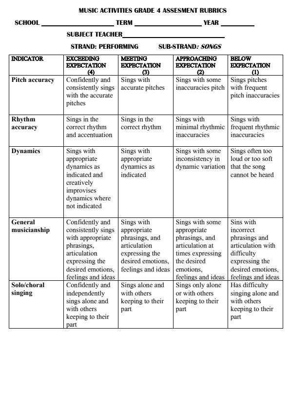 MUSIC ACTIVITIES GRADE 4 ASSESMENT RUBRICS