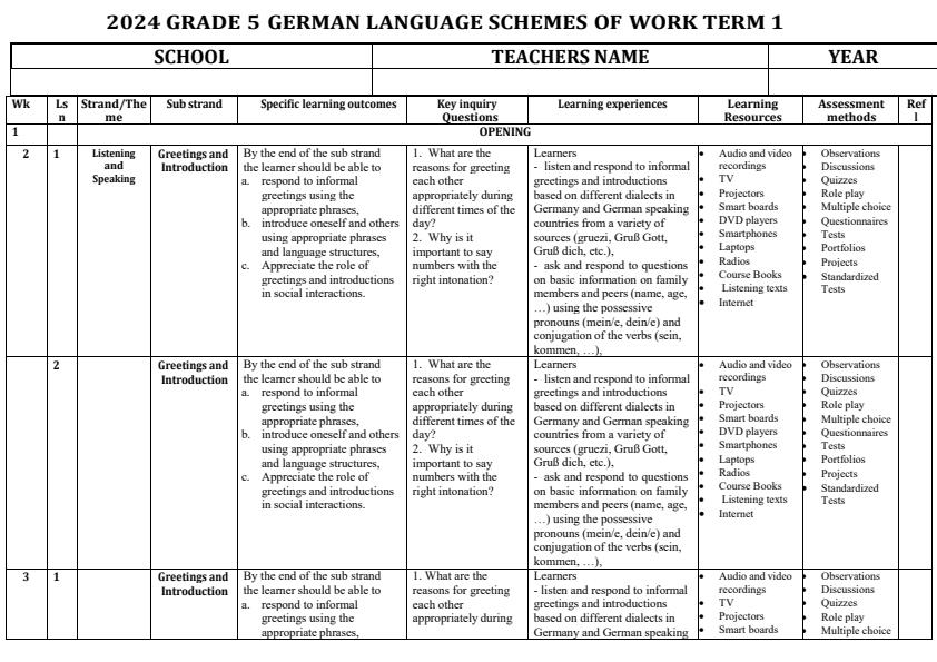 Download 2024 Grade 5 CBC German Language Schemes of Work Term 1. Prepared with curriculum design for use with any course book.